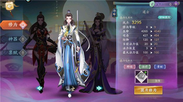5、增加修为,玩家可以在修为系统中提升你的修为,会增加你各方面的属性,还会解锁你的技能。此外在修为系统中还可以通过装备神器并且提升神器的等级来提升战力。当等级达到26级,还可以开启禀赋玩法,这也会大大提升你的战力。