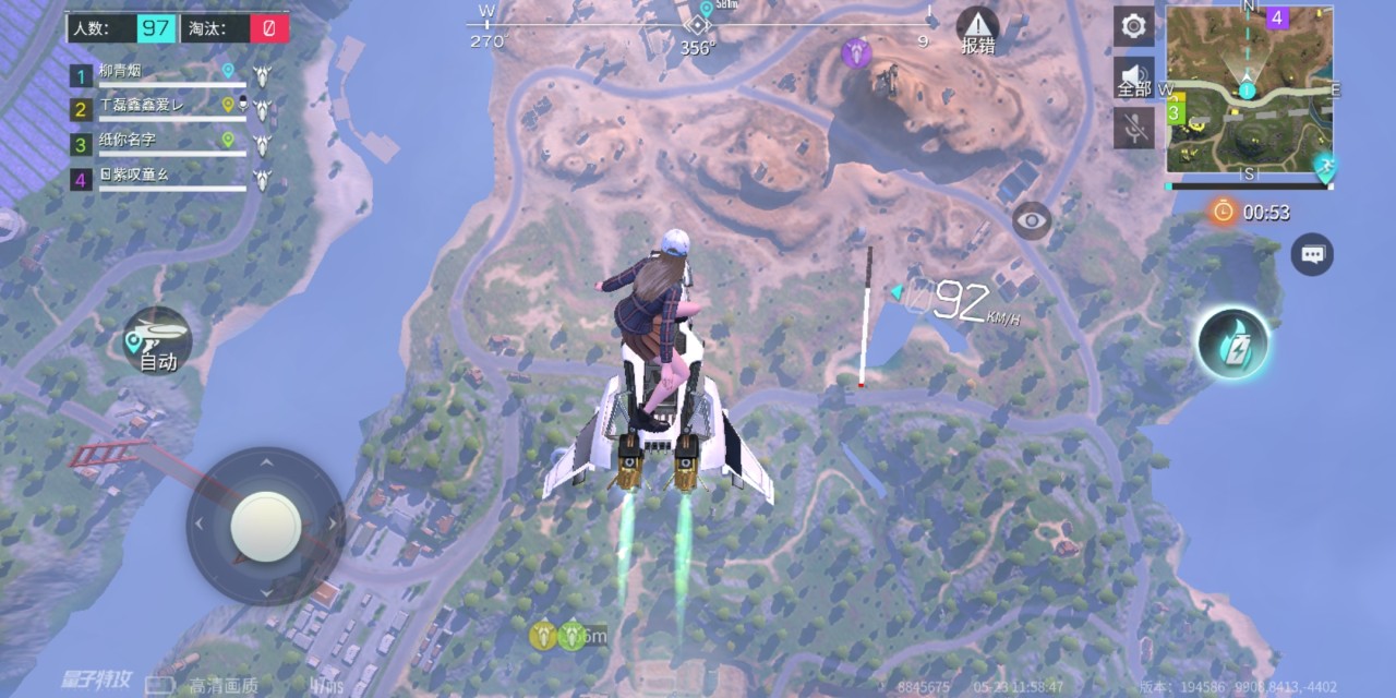 使用滑板降落时会面临两种情况,第一种情况是与目标非常近,此时就要采取速降策略,否则如果目标点敌人过多就很容易落地成盒。玩家可通过拖动左侧陀螺仪来调整滑板转向与倾斜角度,角度越大越容易更快降落,最后再点击右侧氮气加速即可。
