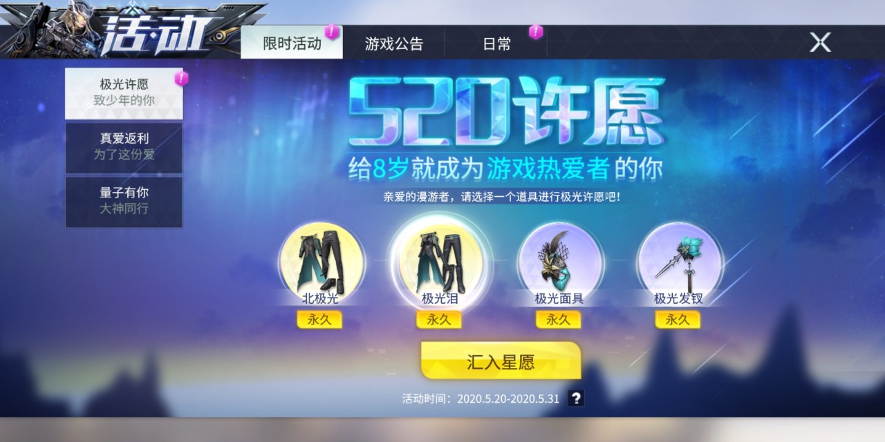 北极光活动共有四个许愿皮肤:北极光套装(男)、极光泪套装(女)、极光面具以及极光发钗,分别需要消耗150/150/90/60星愿硬币兑换。这里需要注意在活动期间只能选择一个皮肤作为许愿道具,活动时间结束星愿硬币将自动作废。
