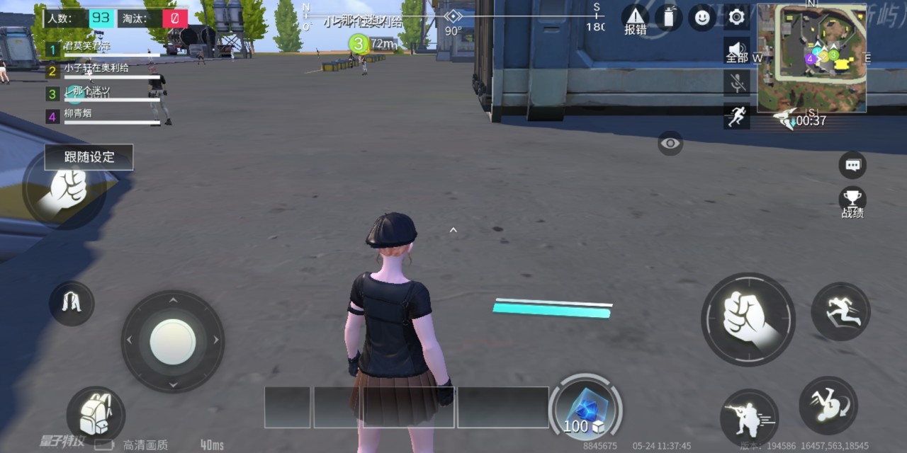小地图默认放置在游戏界面右上角,其中紫色箭头代表玩家自己,蓝、黄、绿箭头代表其他三名队友。地图中的黄色方块代表建建筑物,通常建筑物密集的区域资源也更丰富,更有利于玩家快速度过前期的发育期。