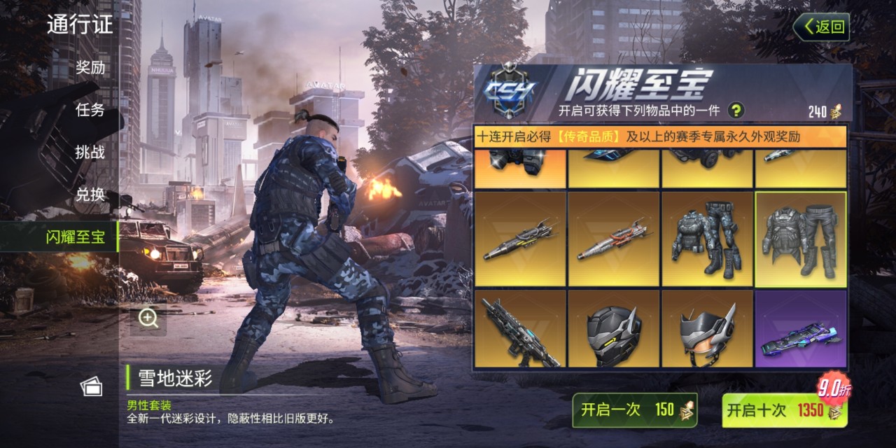 闪耀至宝相当于通行证的抽奖系统,可获得雪域时装、汽车及武器涂装、黑鹰头盔等奖励。150个赛季勋章可抽奖一次,十连抽将必定获得传奇品质以上的涂装或时装。