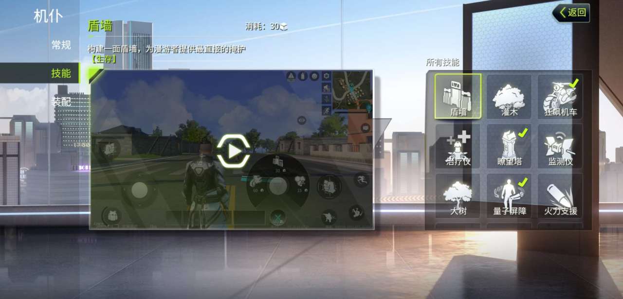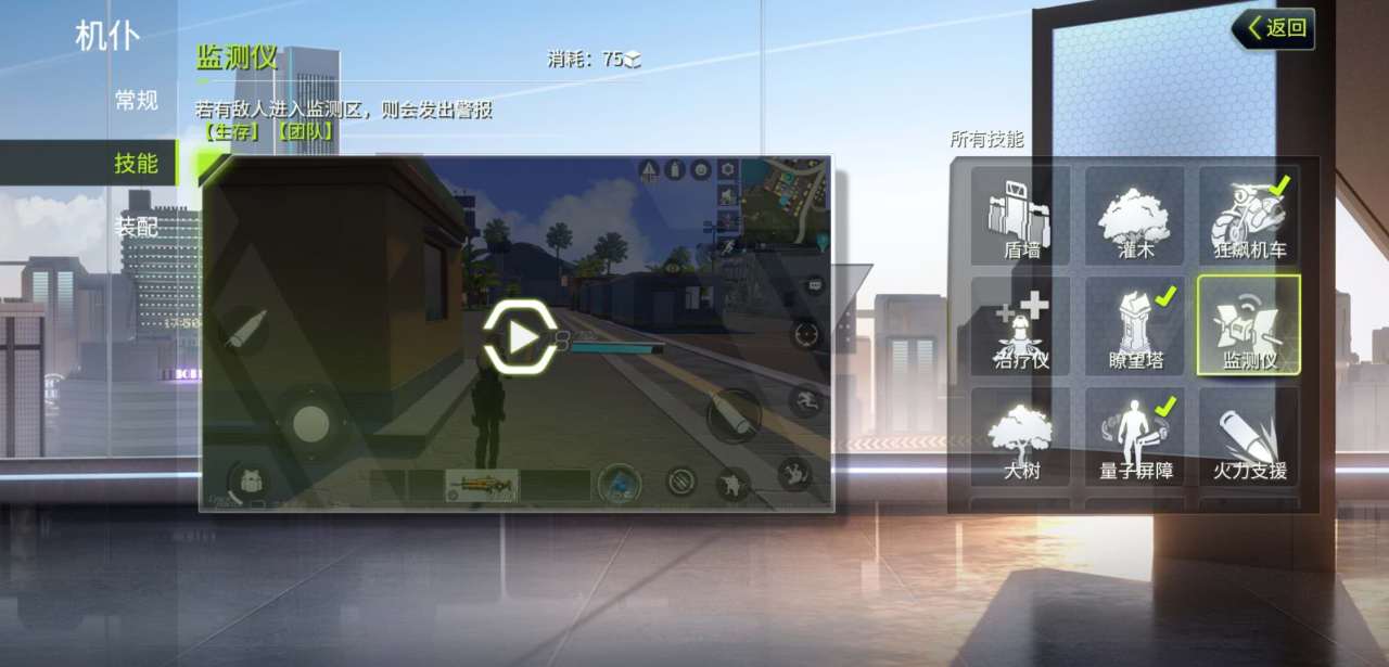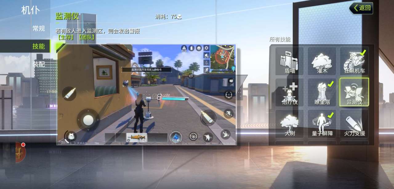 检测仪的设置是在机仆设置栏中的,点击进入就会出现一些作战设置,包括:常规设置、技能选择、玩家装配。点击进去技能选择设置按钮,会显示量子特工中玩家可以使用的所有作战技能。不仅仅只有检测敌人的技能,还有的是用来掩护、降低伤害的技能,以及让玩家用来让自己快速回复健康的技能。