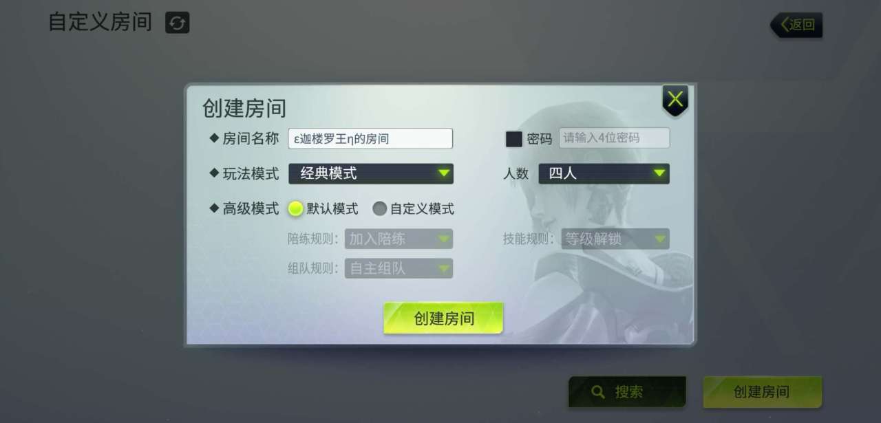 除了系统随机的组队方式之外,玩家可以自己开设组队房间的。还是在游戏模式选择界面中,在最下方的位置有自定义房间,玩家点击进入可以创建房间。玩家完善创建房间的各项信息之后还需要选择时长的,选择不同的时长还需要花费一定数量的点券的。对于多金的玩家来说,创建房间邀请好友一起来游戏的舒适度也很强悍哦!