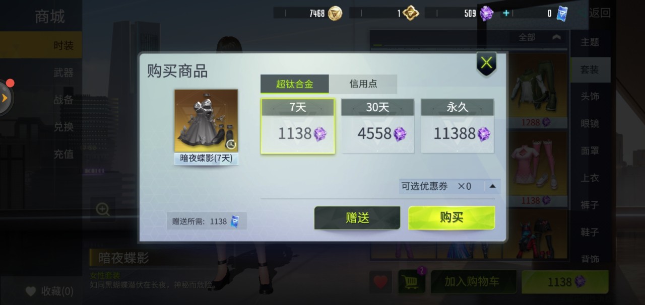 在选择支付方式(使用超钛合金还是信用值)时找到可使用优惠卷,点击时装体验卷就可以免费获得时装的体验时间啦。