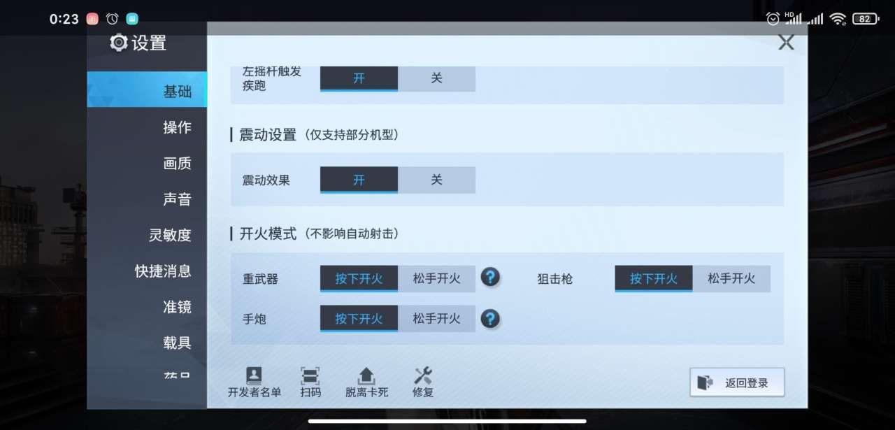 玩家进入到设置界面在第一栏中的基础设置中就可以找到相关的开火设置。玩家往下滑动基础设置栏界面,在开火模式中就可以找到狙击枪的开火设置。开火模式的设置只有两种方式:按下开火、松手开火。玩家擅长使用哪种开火模式就点击即可,这里面不仅仅包含狙击枪的开火设置,还包含了手炮、跟重武器的。此处所有枪械的开火模式设定对于自动射击状态是不起作用的。
