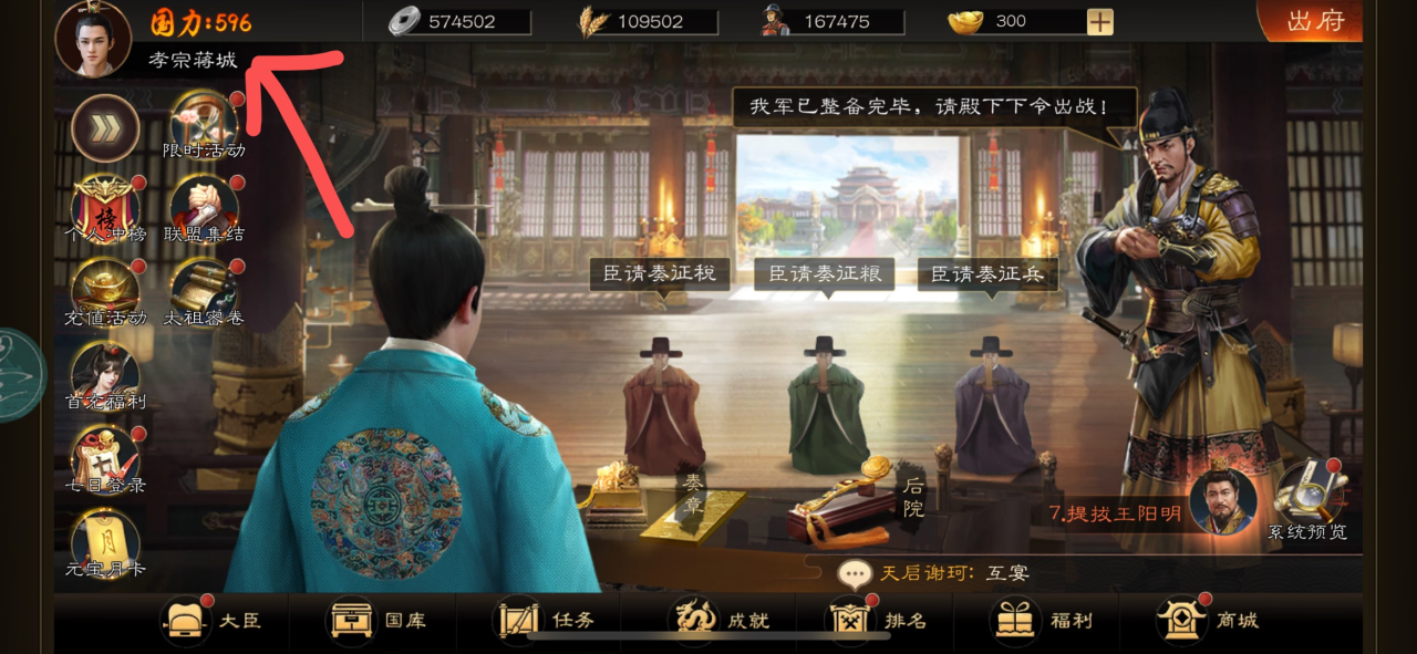 除了以上两种方法,完成每日任务或者登陆领取奖励均可得到银两。前期只需要将银两多用于升级大臣,就能够快速的提升国力。