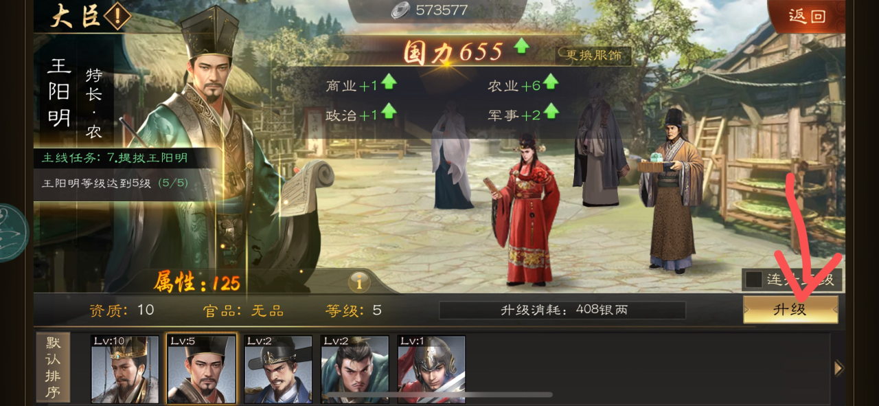 第四步:选定大臣之后右侧有一个升级的图标,点击升级图标就可以对大臣进行升级。