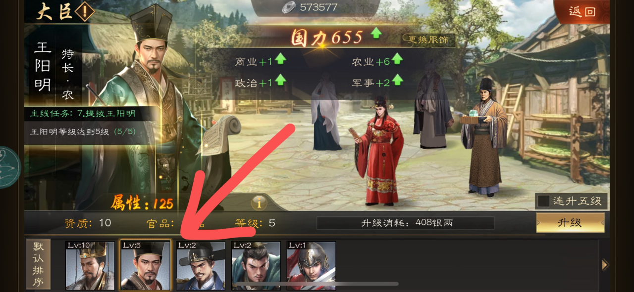 第三步:在大臣详情界面的下方有所有当前拥有的大臣的列表头像,每一个头像代表不同的大臣,大臣主要分为商业大臣、农业大臣、政治大臣和军事大臣四种类型。点击大臣的头像可以就会出现大臣的类别和属性。如图王阳明大臣的详情界面会显示他属于农业大臣,下方的属性有资质、官品和等级三方面的详情。