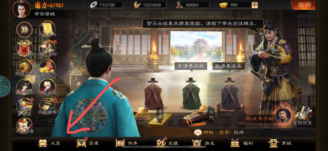 第一步:点击游戏主界面左下角菜单栏的【大臣】图标,进入大臣的详细界面。