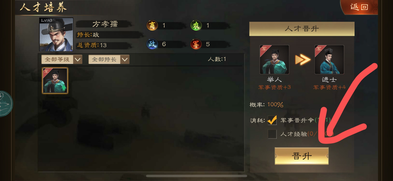 第八步:不同人才的晋升进阶需要不同的晋升令,如果是军事人才需要军事晋升令,晋升令会在刑部惩罚犯人、在关卡讨伐敌军和完成活动任务后获得。