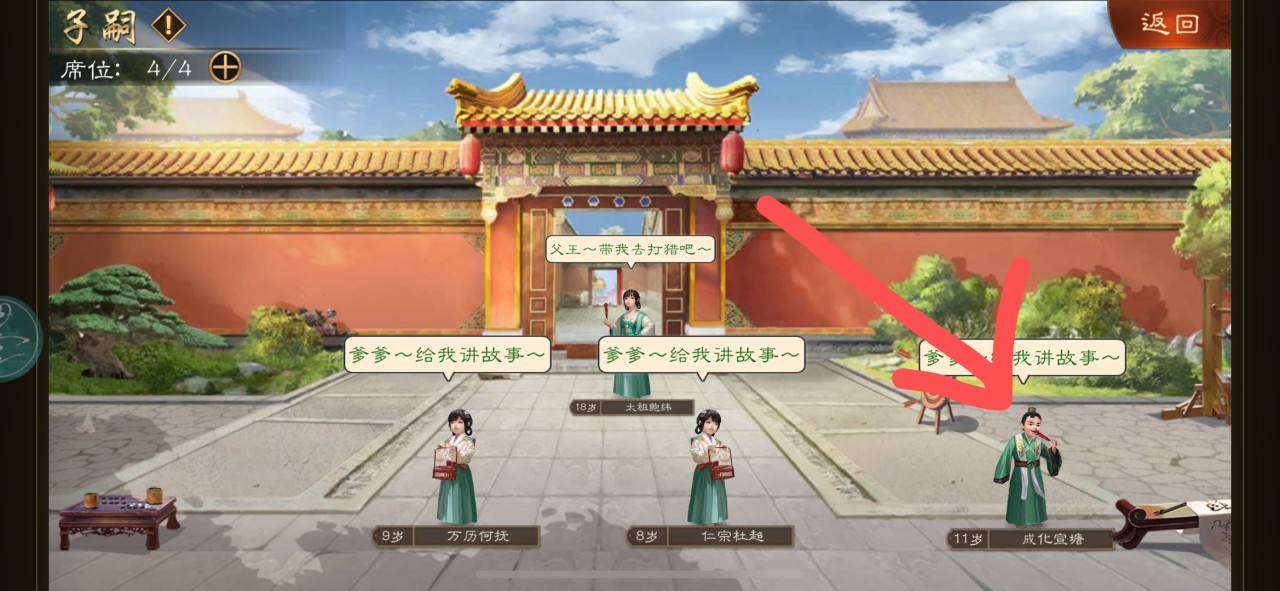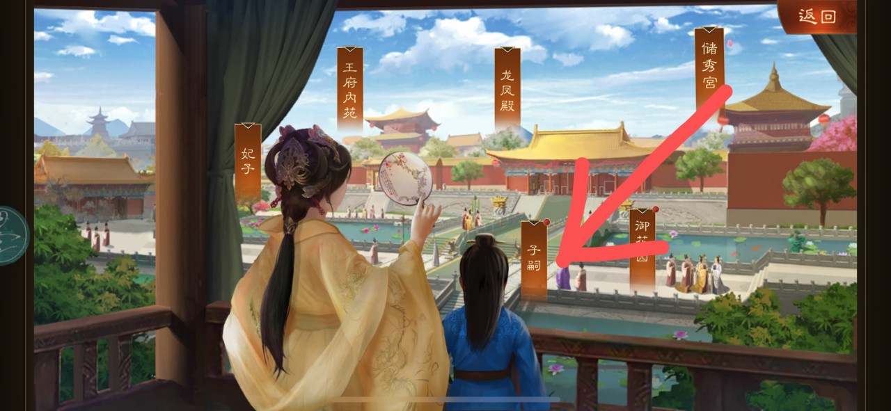 第二步:在后院就可以看到妃子的旁边站着一个小孩,右侧有一个【子嗣】图标,点击该图标进入子嗣的详情界面。