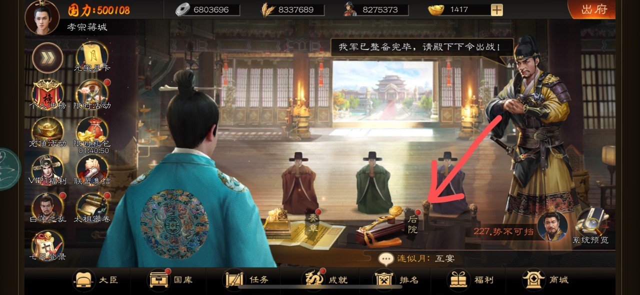 第一步:点击游戏主界面的【后院】图标,进入府内的后院。