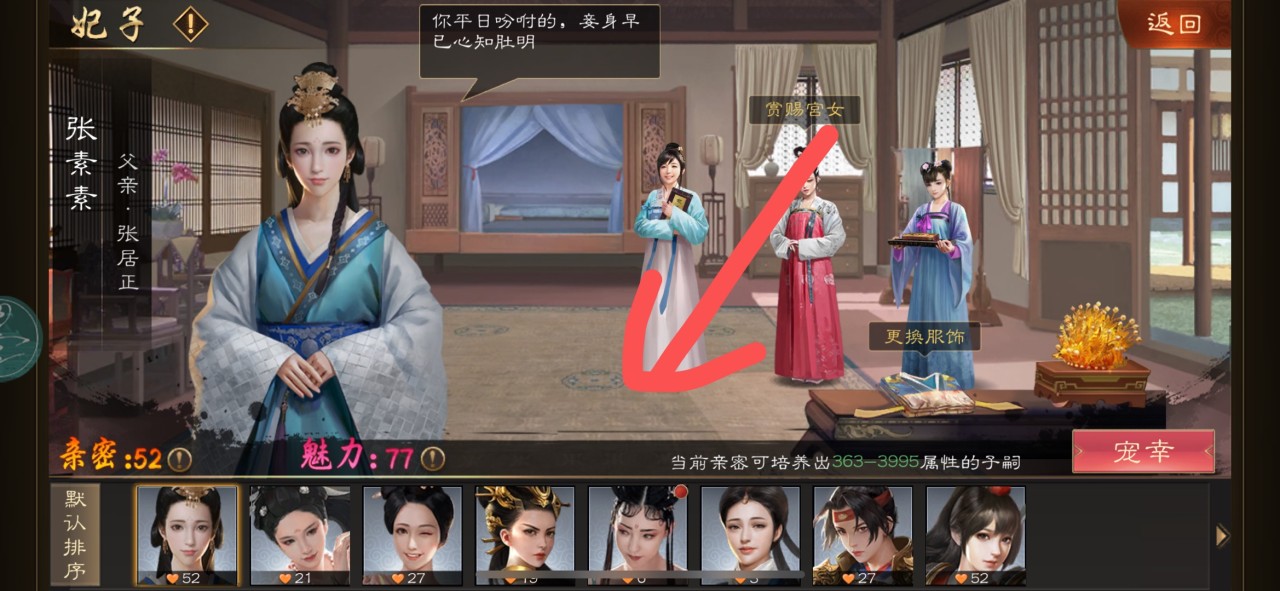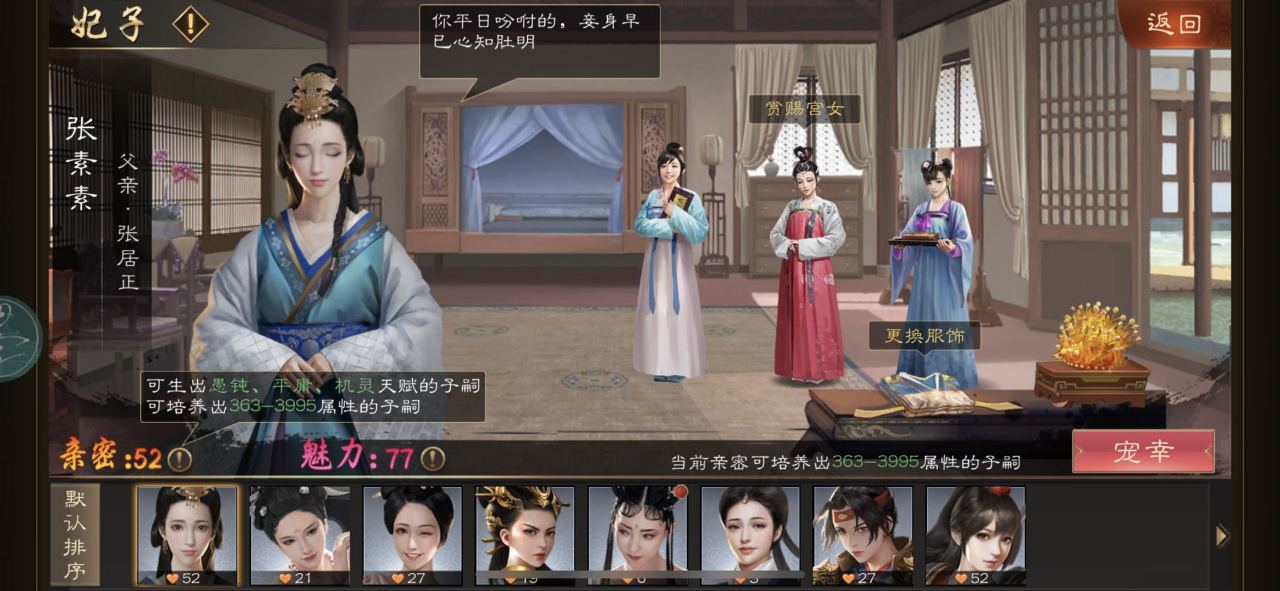 第九步:亲密度越高的妃子产子嗣天赋就越高。