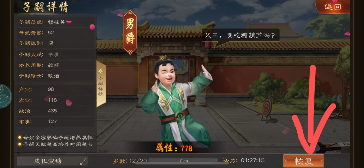 第六步:如果不相等子嗣的培养冷却好,想要快速的培养子嗣,可以在未冷却好时点击右下角的【恢复】图标。