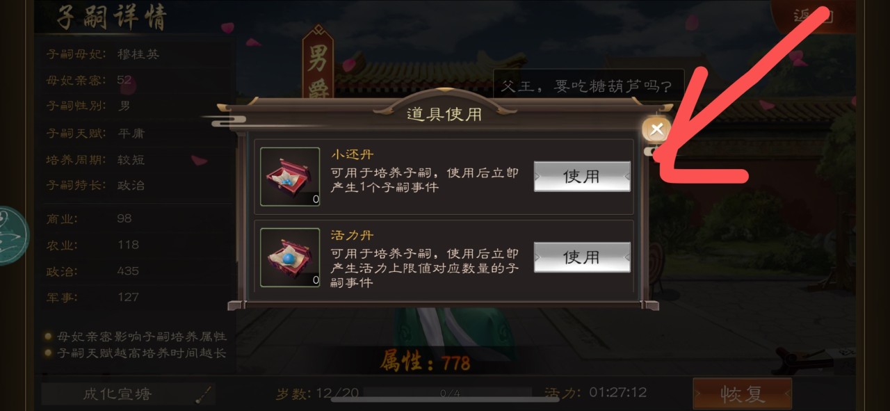 第七步:可以使用小还丹或者活力丹这类道具,就能够快速的培养子嗣。小还丹使用后离子产生一个子嗣事件,提升一个等级。活力丹使用后可以立即产生活力上限值对应数量的子嗣事件。