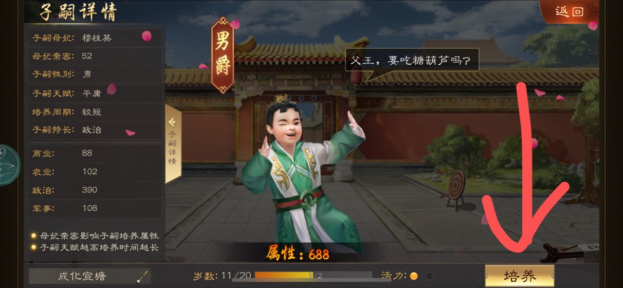 第四步:在该子嗣的界面左侧的菜单栏可以看到子嗣详情,注明母妃是哪一位,性别,天赋等具体的属性。下方有子嗣的属性值和他的年纪,子嗣20岁为成年。所以我们要一直培养他们到20岁。点击右下角的【培养】图标进行培养。