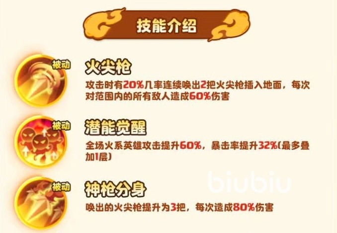 所以赤焰魔童并不等于哪咤,这一点大家要记住。在技能方面,三个被动分别是火尖枪、潜能觉醒和神枪分身。火尖枪的效果是在进行攻击时,有20%的几率,连续召唤出两把火尖枪插入地面。每次都能够对范围内的敌人造成60%的伤害。潜能觉醒使得场上的火系英雄攻击力提升60%,暴击率提升32%,这个效果不可以叠加。