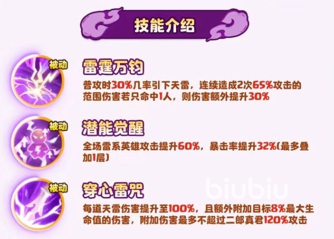 二郎真君的三个技能分别是雷霆万钧、潜能觉醒和穿心雷咒。雷霆万钧的效果是在进行普攻时,有30%的几率引下天雷,连续造成两次65%攻击力的范围伤害,如果此技能只命中一人,则伤害额外提升30%,所以在对付单体目标时也有着很不错的表现。潜能觉醒使得场上的雷系英雄攻击力提升60%,暴击率提升32%。
