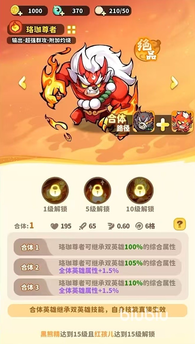 珞珈尊者的第1个技能火拳冲击,一级就可以解锁,在攻击时有30%的几率使出火熊拳,造成120%的范围伤害。第2个技能潜能爆发,需要5级解锁,我方场上的所有火系英雄攻击提升88%。第三个技能火拳强化,十级才能解锁,火熊拳砸地伤害提升到180%,并能够附加4秒的灼烧效果。灼烧最多叠加4层,每秒钟可以造成30%攻击力的伤害,叠加到满层后,仅仅是灼烧造成的输出就非常可观。当大家在解锁合体图鉴后,还可以使用悟道琼浆来提升合体后的形态等级,进而获得更多的双英雄综合属性继承。