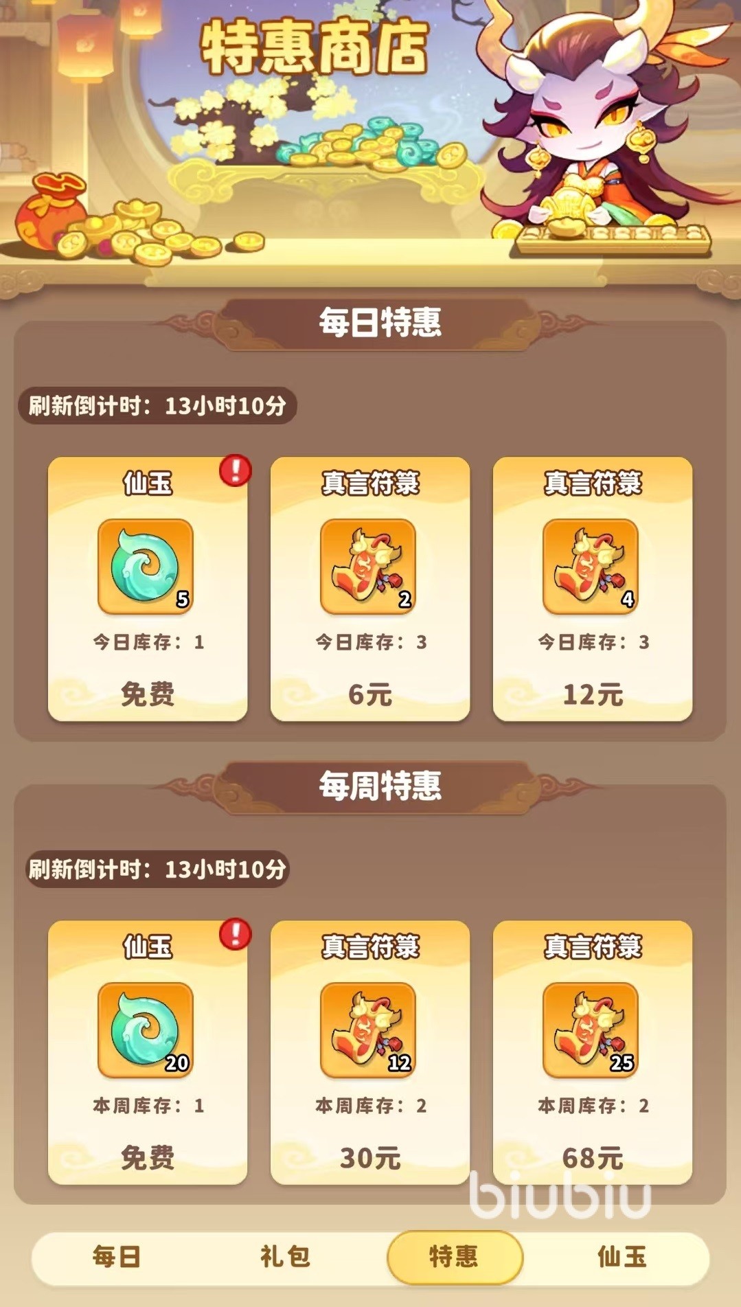 这款游戏现在刚刚开服,所以里面有着非常多的活动,这对于氪金玩家来说是拿资源的好地方。先来看一下最常规的内容。首先是首充一定要拿下,赠送的魔宠是前期推图的关键,然后是特惠商店,特惠商店中除了免费获得的资源之外,法宝乾坤袋、珍品宝箱钥匙的每月特惠购买性价比非常高,其次是每周特惠,每日特惠,建议氪金玩家也都拿下。然后将战令打开,月卡方面分为大月卡和小月卡,这两个月卡也都需要购买,一个月可以获得大量仙玉和多种特权,快速提升战力。