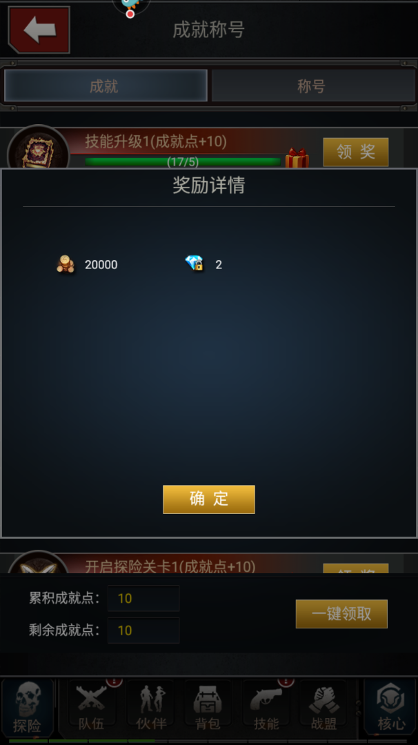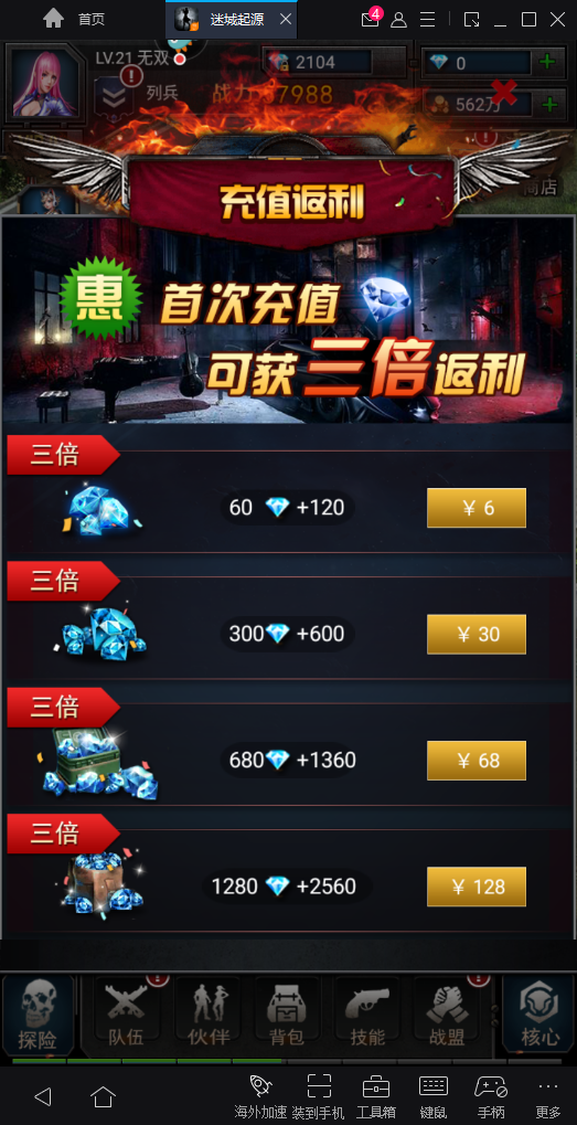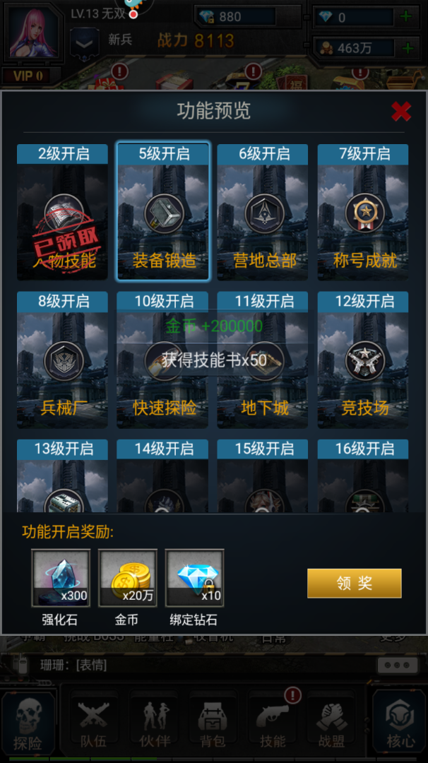 升级。每次升级之后都会多出一个功能,而我们开启功能之后就能得到奖励了,除了钻石还有其他的,比如强化石、金币等等。