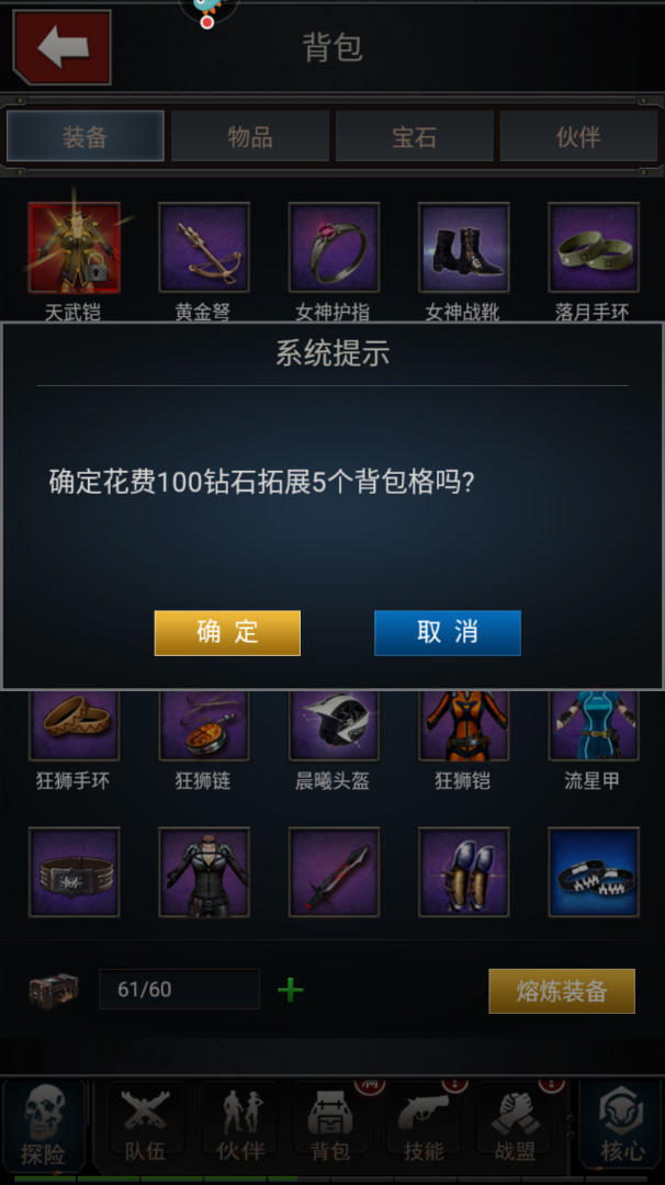 原始背包栏只有60个格子,想要更大的背包就需要用钻石去扩展,每扩展5个格子需要100个钻石。
