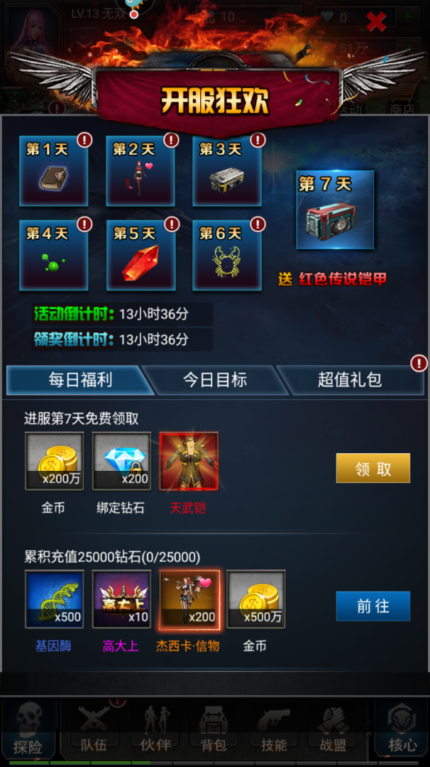 首先我们来说说钻石的获取方式吧。点击主页面的“开服狂欢”,在这上面能看到第一天到第七天的每日福利、今日目标、超值礼包,然后我们挨个去领取就可以了,能领取到很多钻石,而且除了钻石之外,还有装备和金币等奖励。