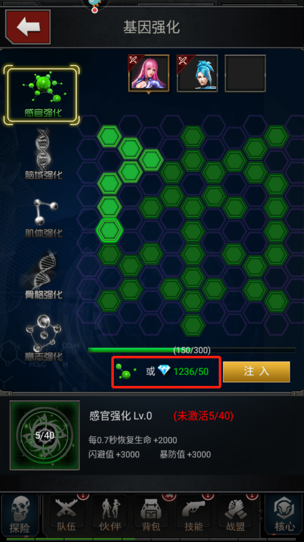 还有就是基因强化,这个功能在队伍里面,当我们的基因种子不够用时可以用钻石来代替基因,强化之后我们的战斗力就会直线上升了。