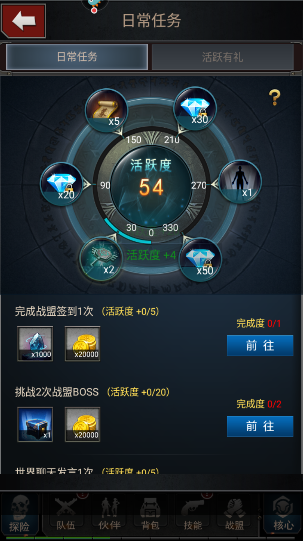 日常任务。按照系统提示去把跃度做满,当活跃度到90时能够得到20个钻石,当活跃度到210时能够得到30个钻石,当活跃度到330时能够得到50个钻石,也就是说只要你随便做这些任务,一天就能免费领到100个钻石!