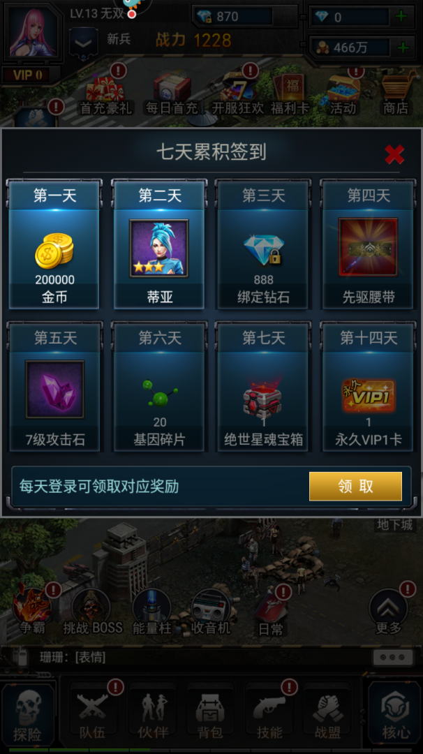 签到。主页面有一个免费VIP的标志,点击它每天都去签到,在第三天时能够得到888个钻石,只要你玩的时间够久,每天都登录,那么之后会有更丰厚的奖励哦。