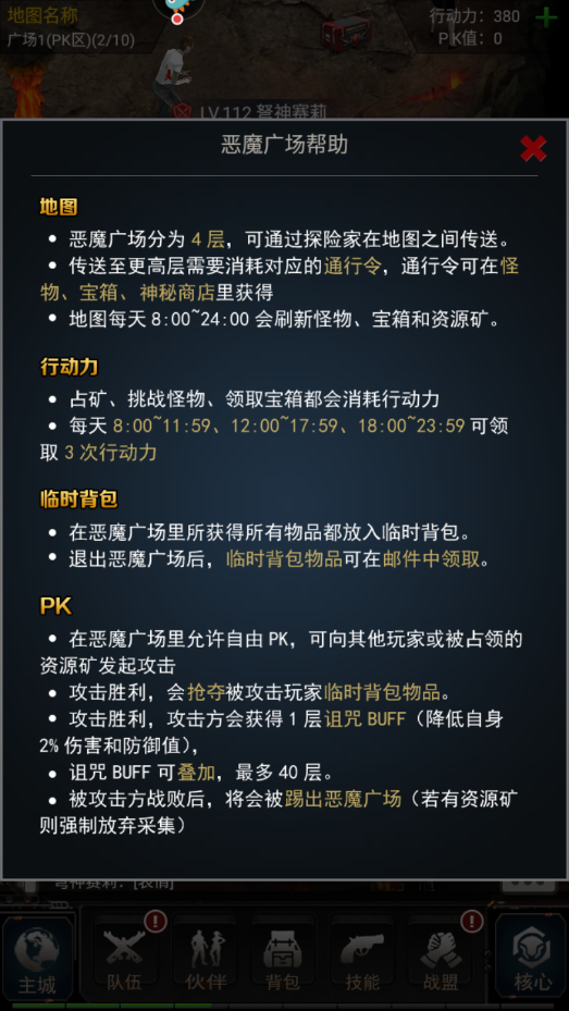 在恶魔广场中是可以自由PK的,也可以被占领的资源发起攻击,如果攻击胜利,会抢夺被攻击者的临时背包物品,并且我们会得到1层诅咒BUFF,BUFF最多叠加40层,但会降低自身2%的伤害和防御值,而被攻击方战败后,则被踢出恶魔广场。