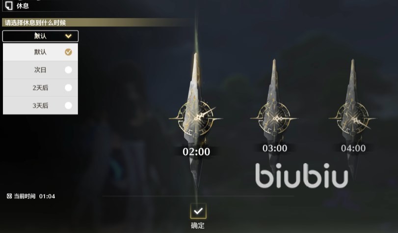 后续想要使用的时候,只要先ESC键打开终端,然后点击右下角“邮件”方便的时钟图标,就可以进入调整时间的界面了。这里会显示让玩家选择休息到什么时候,默认会有默认、次日、2天后、3天后这四个选项,大家可以根据自己的需求去选择。