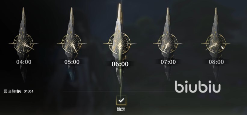 选择日期之后,拖动下方的“石柱”,就可以调整具体的时间点了,选择好之后点确定就会出现一个时钟转动的动画,待动画播放完毕就直接休息好了,时间也来到了玩家设置的时间点了。