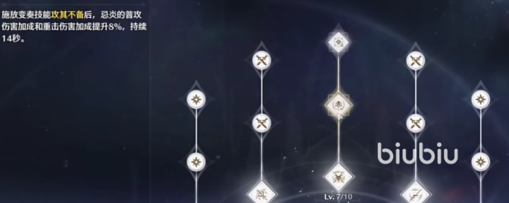 然后咱们得聊聊协奏技能,特别是“克己”这个技能,它能让忌炎在队伍中更加灵活多变。当下一个队友打出暴击时,忌炎就能迅速登场继续输出,这种无缝衔接的打法简直不要太爽。如果玩家在游戏初期感觉队伍里输出不够,那就多给“克己”加点吧,它能让玩家的队伍整体实力提升不少。