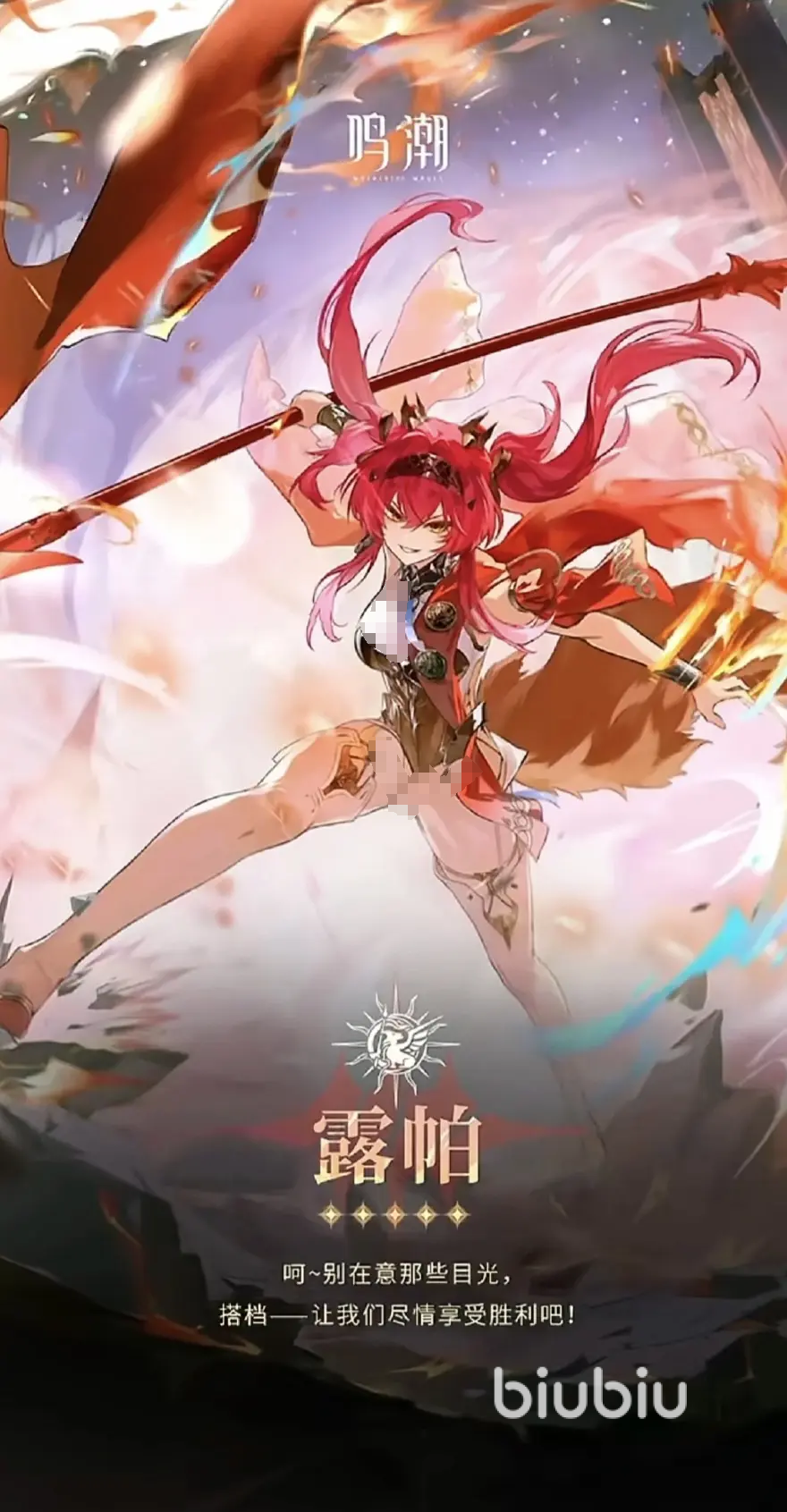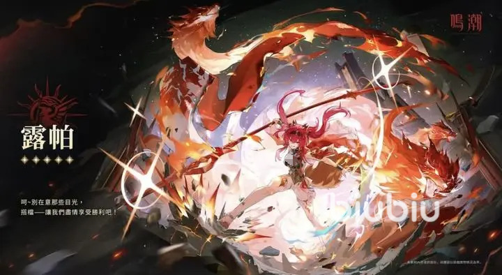 露帕是五星的火系角色,以热熔伤害作为核心,兼具输出和队伍的增益效果。共鸣施展后,她会朝着敌方投掷旗子,使用期间能恢复自己15点狼焰,敌方受到热熔损伤,并对敌人进行持续8秒的标记,在使用共鸣技的一定时间之内,都可以放出凶噬,也能在较低的半空使用。