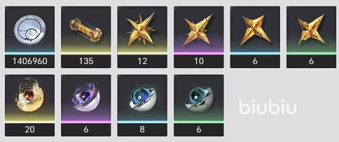 这其中46个不朽荣耀、60个血叶荚迷为新版本材料现在是无法获取的,需要等版本更新后才能获取,因此建议大家多存点体力到时候去刷,之后是该角色武器所需要的材料,武器方面需要准备140万贝比。