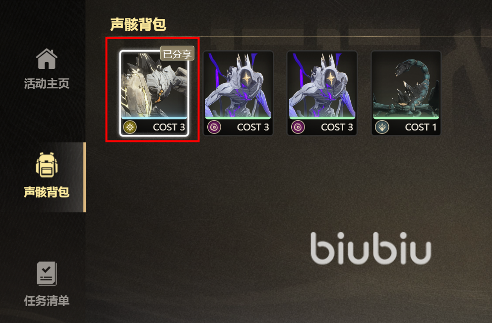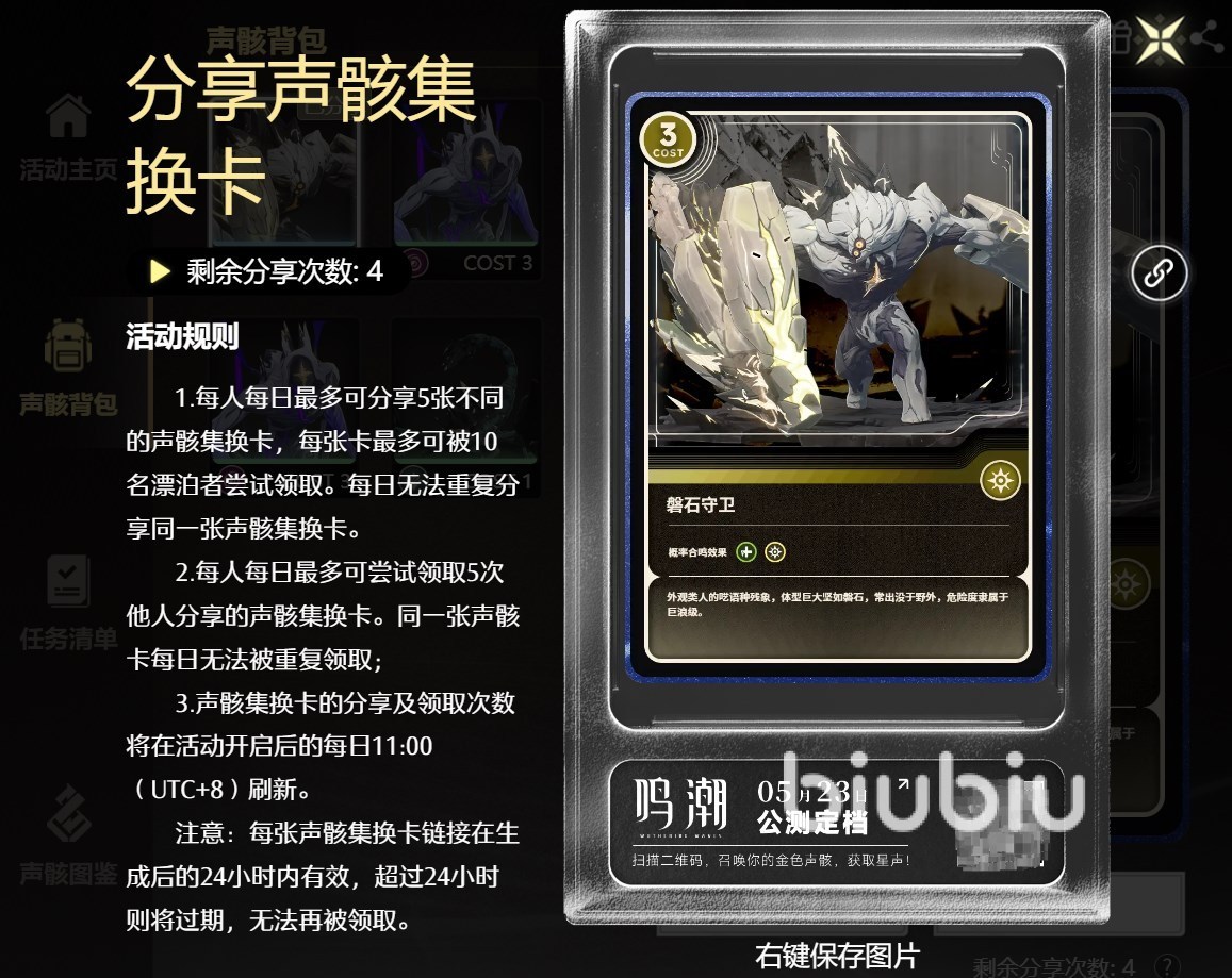 而分享则是将该活动界面分享给其他玩家,分享者可以得到抽卡次数,对方也可以得到这张声骸,这样大家就有机会将全部声骸收集齐全。注意这里的分享并不是分享一个链接给朋友,而是要将分享界面生成的图片保存好,直接将图片分享给好友。