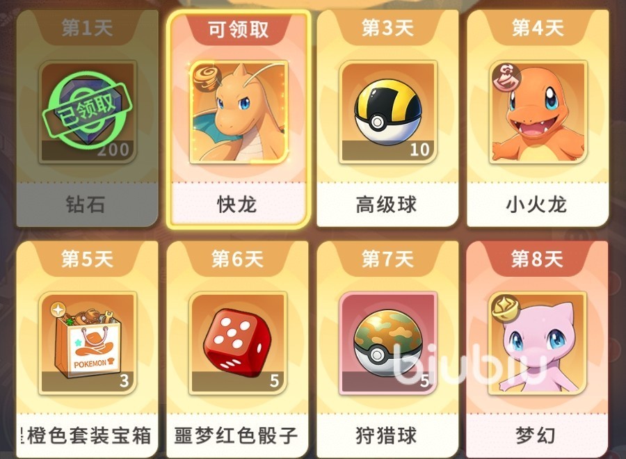每日登录后,可在【8天登录】活动中签到领取福利,第2天能拿到【快龙】,第4天可获得【小火龙】,第8天能领取SS级宝可梦【梦幻】。