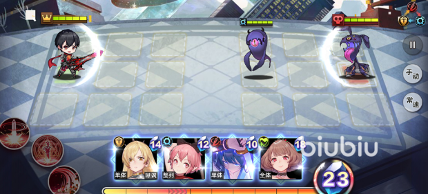 战斗时双方会占据各自的九宫格阵地,其中主角8号位在战斗开始前就会站在场上,大多情况下先击败敌方8号位的一方就会被视作胜利,所以攻击敌方8号位并为己方的规避伤害便是新手要学会的核心战术,cost是战斗时候的主要资源,会随着时间来增加,当这个资源不足时角色头像会呈现灰色,足够时就可以选择待命的角色拖动到己方的站位格中协助作战,一旦放入后将无法再改变位置,新上阵的角色会立刻释放一次必杀技扭转战局,被击杀后将无法再次上阵,比较特殊的8号位会通过在战斗中受击或攻击来积攒怒气,释放出威力超强的必杀技。