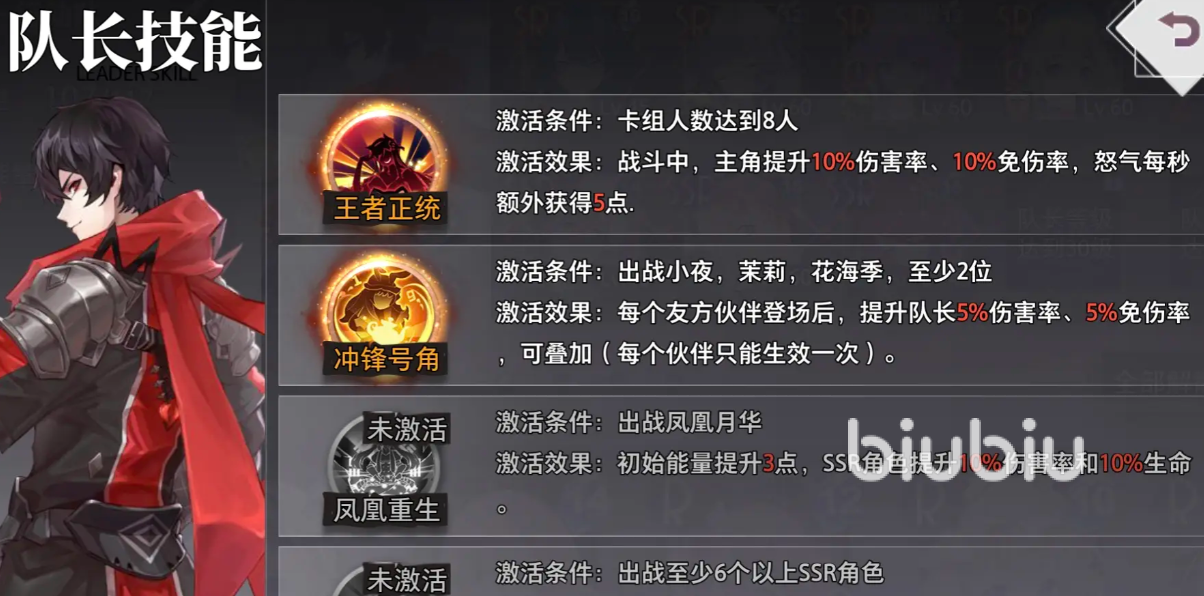 阵容搭配方面,游戏以队长系统为核心,不仅他的生存关系着胜负,同时光环的加成也非常大,所以新手在不知道怎么搭的情况下想让强度变高可以先从队长入手,尽量激活他的光环,以下图为例想要激活冲锋号角,就需要出战小夜、茉莉和花海季的两位,这样上阵后再搭配2到3个范围伤害、1至2个奶妈即可。