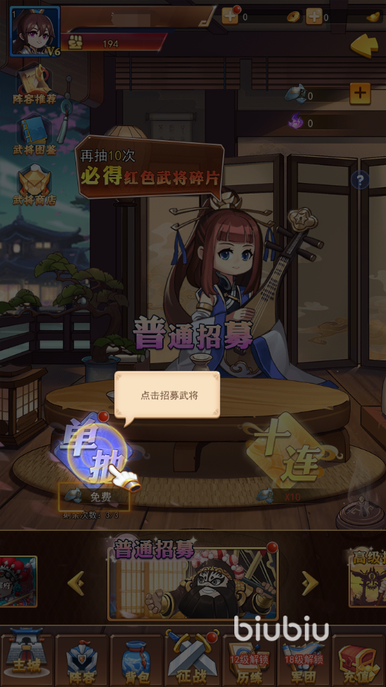 游戏里抽卡这块的话也是单抽加十连抽的两种形式,奖池也有多个,前期还算良心,免费赠送了不少次的单抽,这使得第一个红卡武将会出的比较快,不过游戏里的武将也会根据风格定位而分成不同类型,只有合理的搭配它们,阵容实力才能得到最大发挥。