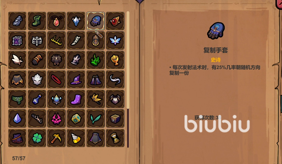 复制手套能在每次发射法术的时候,有25%概率朝随机方向复制一份同样的,由于其需要消耗25血上限,血所以推荐血多时选择。