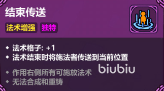 结束传送也属于增强类,它能让法术格子加1,并且在施展结束时,将施法者直接传送到当前位置,这个瞬移效果,可以有效在怪物贴脸的时候,帮助躲避。