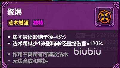 聚爆属于法术增强类,它能让所有法术最终影响半径减少45%,但每减少1米的影响半径就让最终伤害提升120%,靠着这一独特能力,搭配上范围增加和坠落,可以让原本平平无奇的闪耀星矢,轻松打出高额的输出。