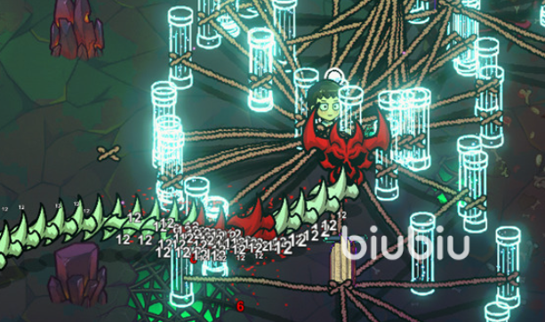 除了这两个核心技外,我们还需要添加一个“公转”,这能让被脐带所链接的光之柱围绕着我们展开旋转,让路径变成范围伤,接着加上一个“加速器”,让柱子快速动起来,这样一套哪怕没有任何伤害加成,只要走位够好就能击败各种小怪。