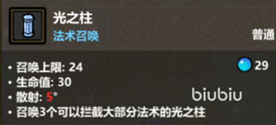 这一套的核心搭配是光之柱和脐带,这两个都属于普通技能非常好获取,光之柱会召唤出3个可以拦截大部分法术的光柱,虽然是防御技,但一旦搭配上会将召唤物连接,并对路径上敌人造成30点秒杀的脐带,就能自动对路径中怪物进行攻击了。