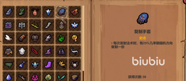 复制手套可以在每一次我们发射法术的时候,有25%的几率朝着随机的方向进行复制,也就是说放出一份同样的,由于其会消耗25的血上限,所以大家在血多时可以进行选择。