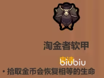 淘金者软甲能在我们每次拾取金币后,让我们恢复同等的生命值,这个拾金币回血的效果,可以说是回血的好道具,缺少血量的时候必选。