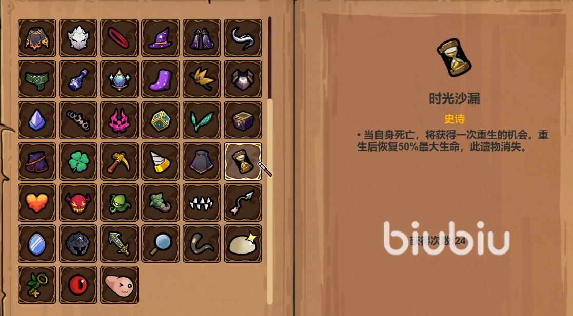 时光沙漏能在自身死亡的时候,直接获得一次重生的机会,重生后会恢复50%的血量,并且此遗物消失,这个相当于多了半条命,任何环境下都可以选。