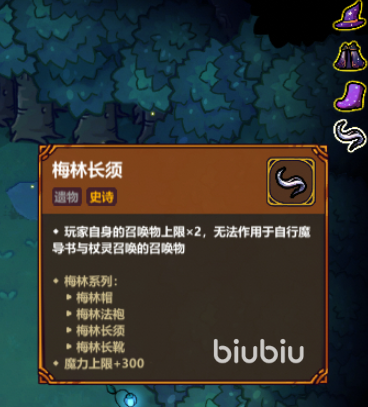 梅林长须能让自身召唤物上限×2,是召唤流的核心遗物,梅林长靴能在各位击杀敌人之后,立刻恢复4点的蓝量,在后期需要击杀敌人数量很多的场面下有很大作用,这时间组合在一起带来的套装效果,能让魔力上限加300。